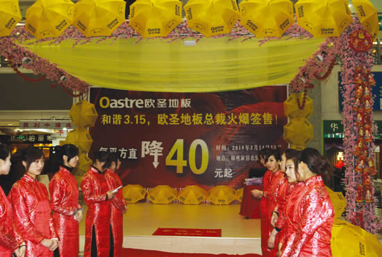 这次活动济南山东营销中心,投入了大量的人力和物力。为更好的提升欧圣地板在泉城人民心中的美誉度,提高欧圣品牌形象。山东济南提前2个月就展开了拉网式宣传,通过户外广告、电梯广告、电台、广播、报纸、110小区广告牌、小区扫楼等方式方法同步展开,进行广泛宣传。在济南掀起一片热潮,在消费者心中家喻户晓,在同行中也是屈指可数的。