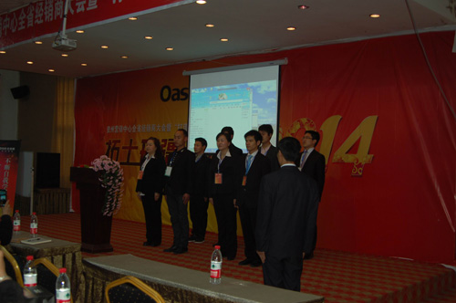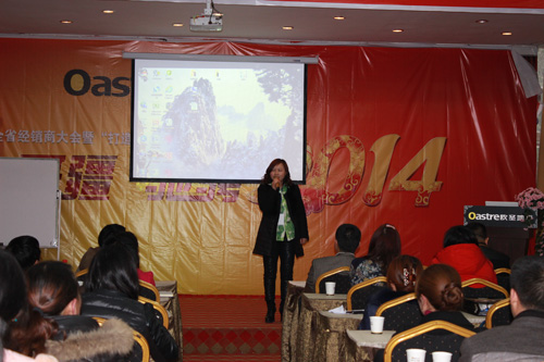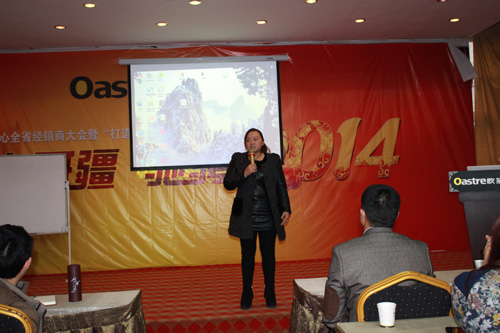 九时,大会正式开始。由营销中心冯总专程请来的聚成股份贵州分部的美女主持小易,在激情的音乐声中向所有与会人员致敬、致意,同时宣布经销商大会及“打造阳光心态”活动正式的开始!主持人首先向所有人员一一介绍了贵州营销中心的冯总,江苏欧圣木业的黄总,山东欧圣的谢总,以及来自兰舍硅藻泥的嘉宾毛总等人。紧接着,大会正式进入开展流程。
